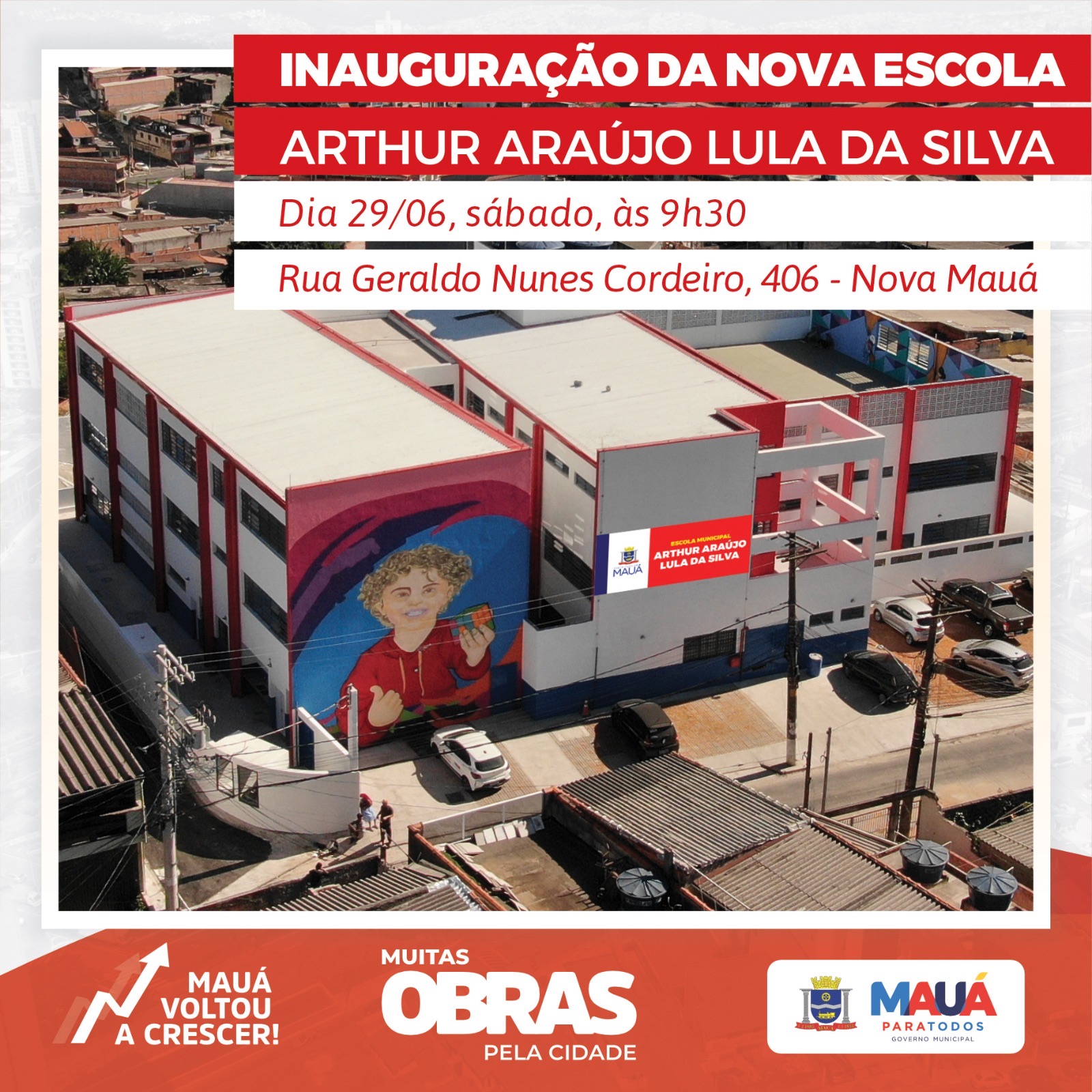 O prefeito Marcelo Oliveira inaugura neste sábado (29), a Escola Municipal Arthur Araújo Lula da Silva, na Vila Nova Mauá. O novo estabelecimento educacional, situado na Rua Geraldo Nunes Cordeiro, 406, oferecerá cerca de 300 vagas para alunos com até 6 anos de idade.