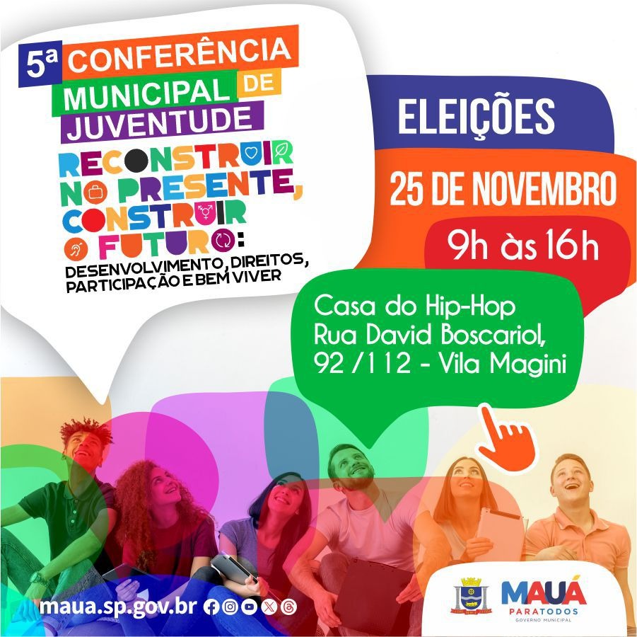 Neste sábado (25), a partir das 9h, será realizada em Mauá a 5ª Conferência Municipal de Juventude, com o tema ‘Reconstruir no Presente, Construir o Futuro: Desenvolvimento, Direitos, Participação e Bem Viver’.