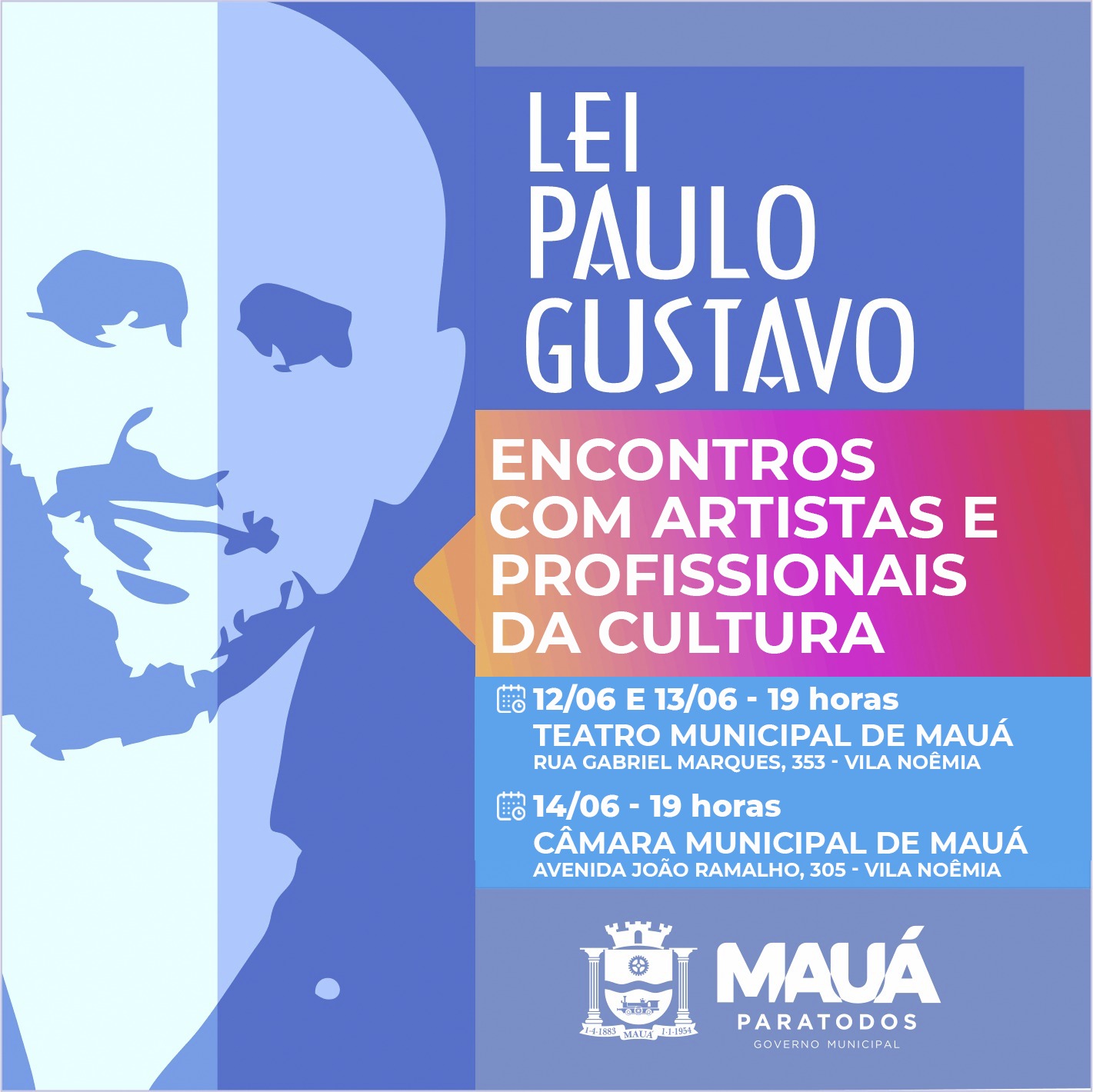 De segunda (12) a quarta-feira (14), a Prefeitura de Mauá, por meio da secretaria de Cultura, promove uma série de encontros com artistas e demais profissionais da cultura para debater a respeito da implementação no município da Lei Paulo Gustavo, aprovada em 2022 e regulamentada neste ano, que visa amenizar os efeitos da pandemia da Covid no setor cultural.