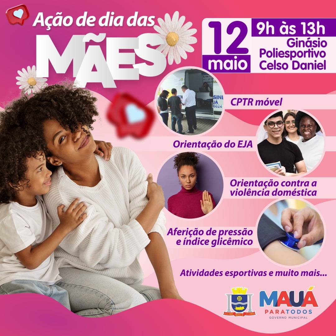 A Prefeitura de Mauá antecipa a comemoração do Dia das Mães com evento nesta sexta-feira (12), das 9h às 13h, no Ginásio Poliesportivo Celso Daniel.