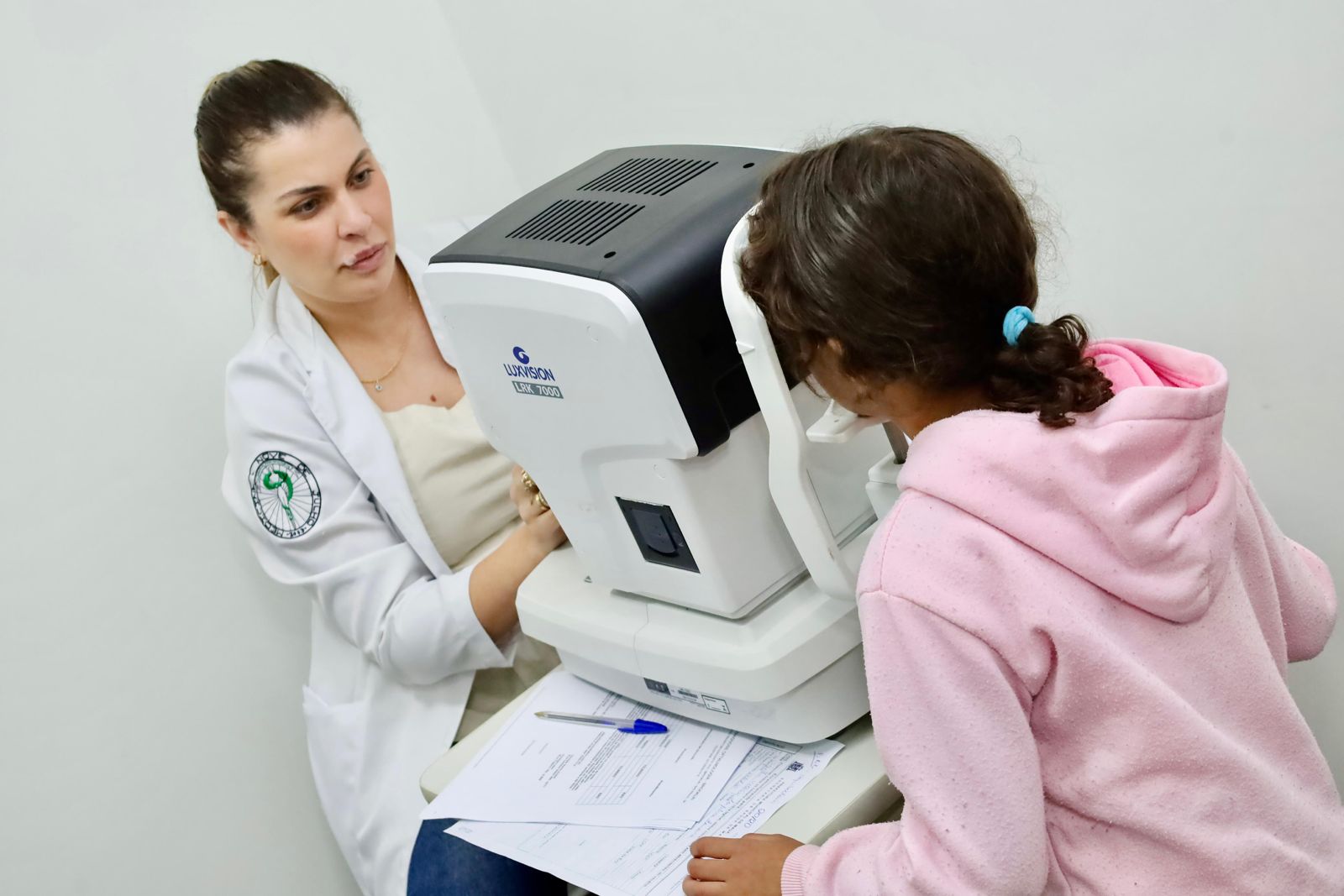 Em seguida, uma pré-avaliação, por meio de um aparelho computadorizado chamado de “AUTO REFRATOR”, fornece informaçõe que serão anexadas à ficha de atendimento e auxiliam o exame médico.
