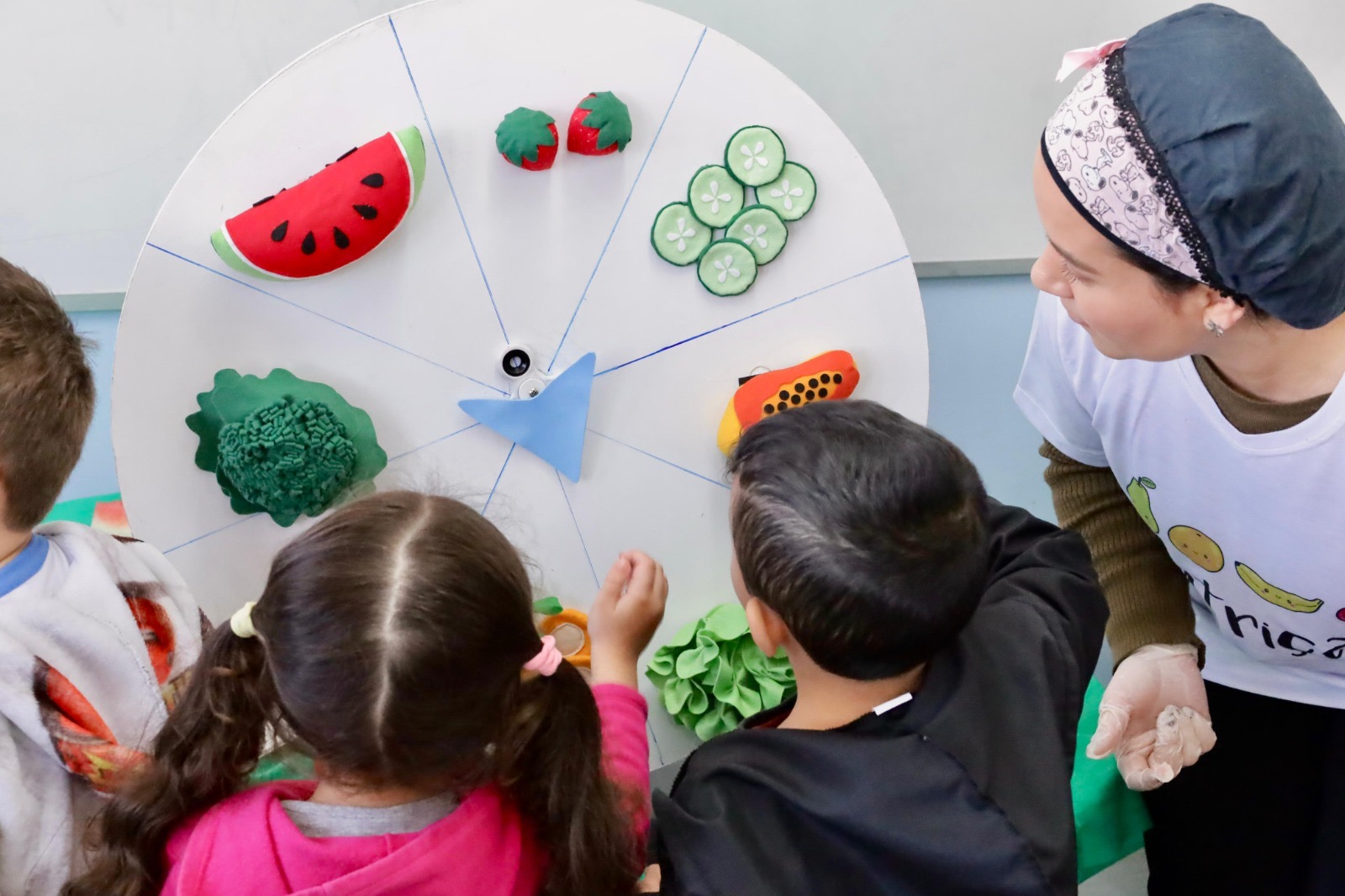 Em uma atividade lúdica batizada de Roleta de Degustação, crianças de 4 anos experimentaram frutas, legumes e verduras de forma divertida e participativa.