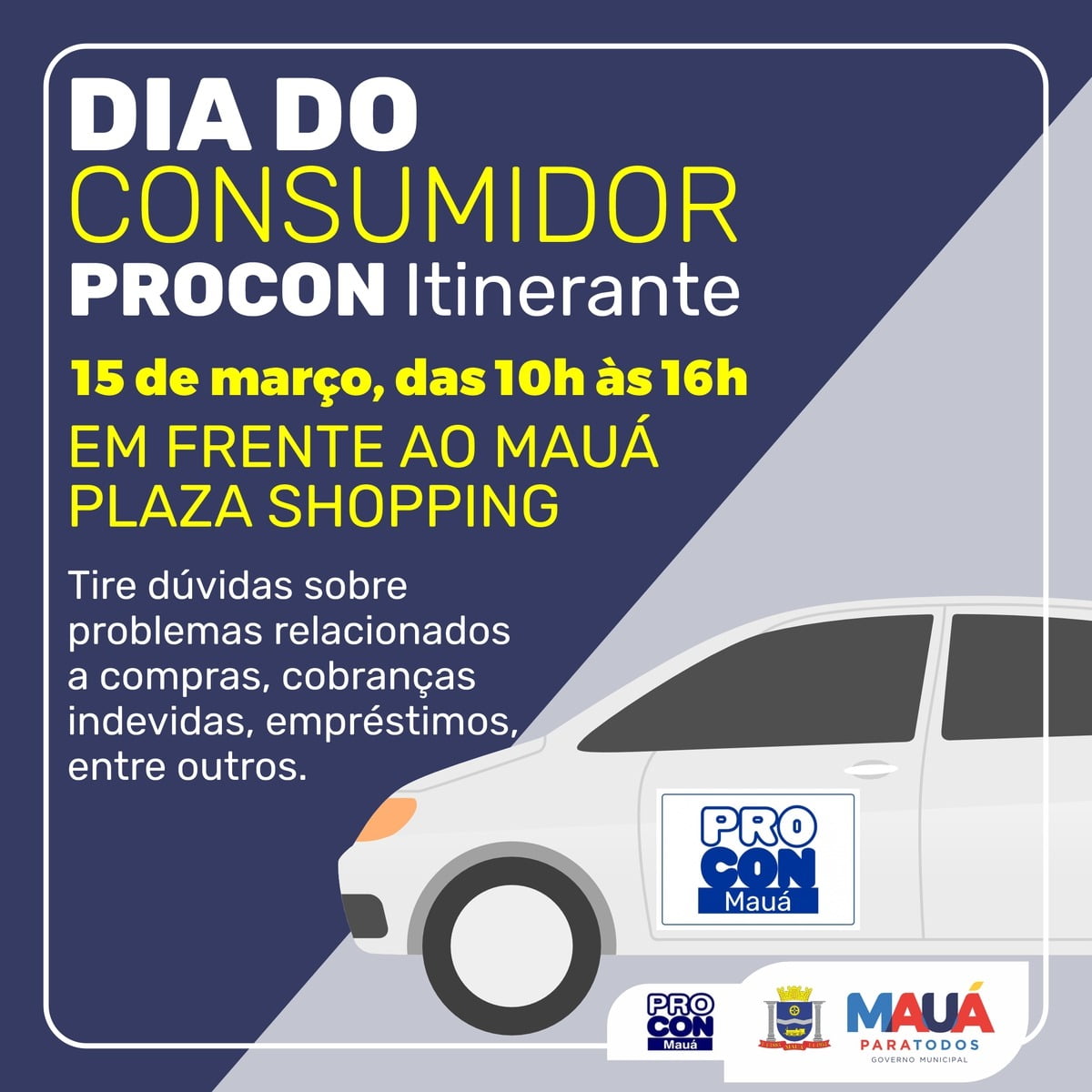 Para marcar o Dia do Consumidor, comemorado nesta quarta-feira (15), o Procon (Programa de Defesa e Proteção do Consumidor) de Mauá fará uma ação das 10h às 16h no calçadão em frente ao Mauá Plaza Shopping. A equipe da instituição, em uma unidade móvel, irá oferecer mais facilidade de acesso aos consumidores, além de reforçar a garantia dos seus direitos.