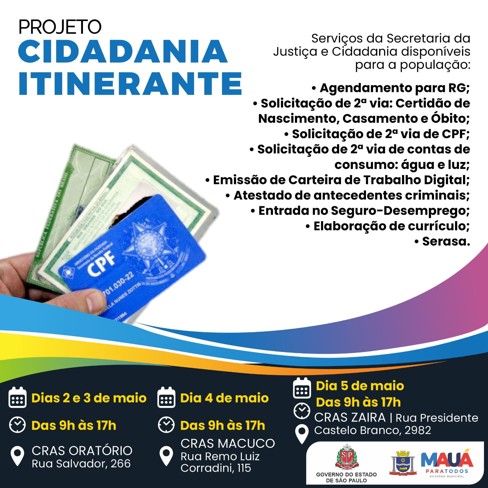 A população de Mauá vai ser beneficiada com os serviços oferecidos pela Secretaria da Justiça e Cidadania do estado de São Paulo, no período de 2 a 5 de maio, das 9h às 17h.