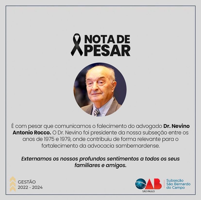 O ex-presidente da OAB de São Bernardo, Nevino Antônio Rocco, morreu nesta quarta (17).
