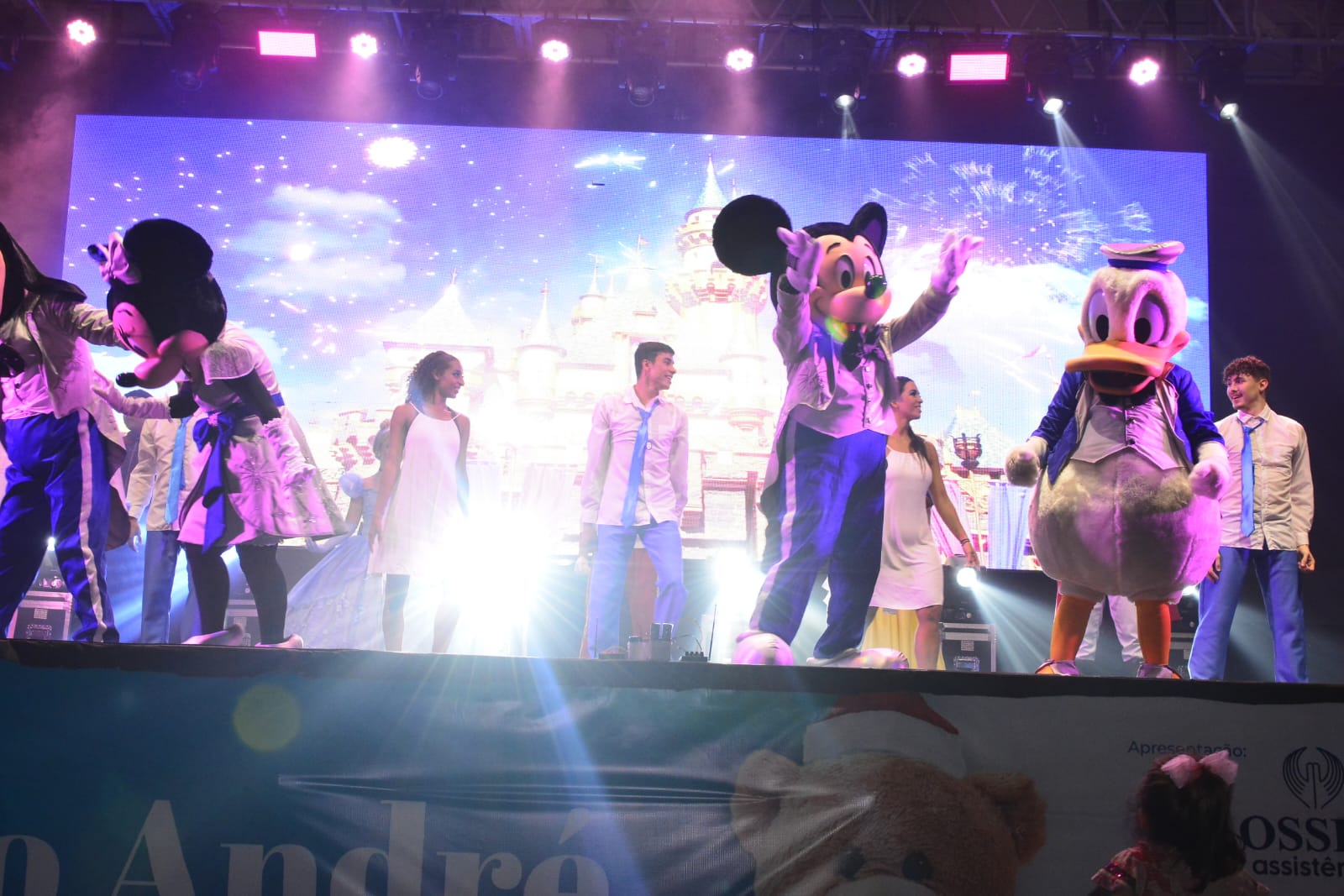 O público lotou o espaço para ver Mickey Mouse, Minnie Mouse, Donald, Pateta, Elsa, Anna, Olaf, Moana, Mirabel, Luiza, Isabela e diversos outros integram o espetáculo musical “Sonhando com o Mickey”.