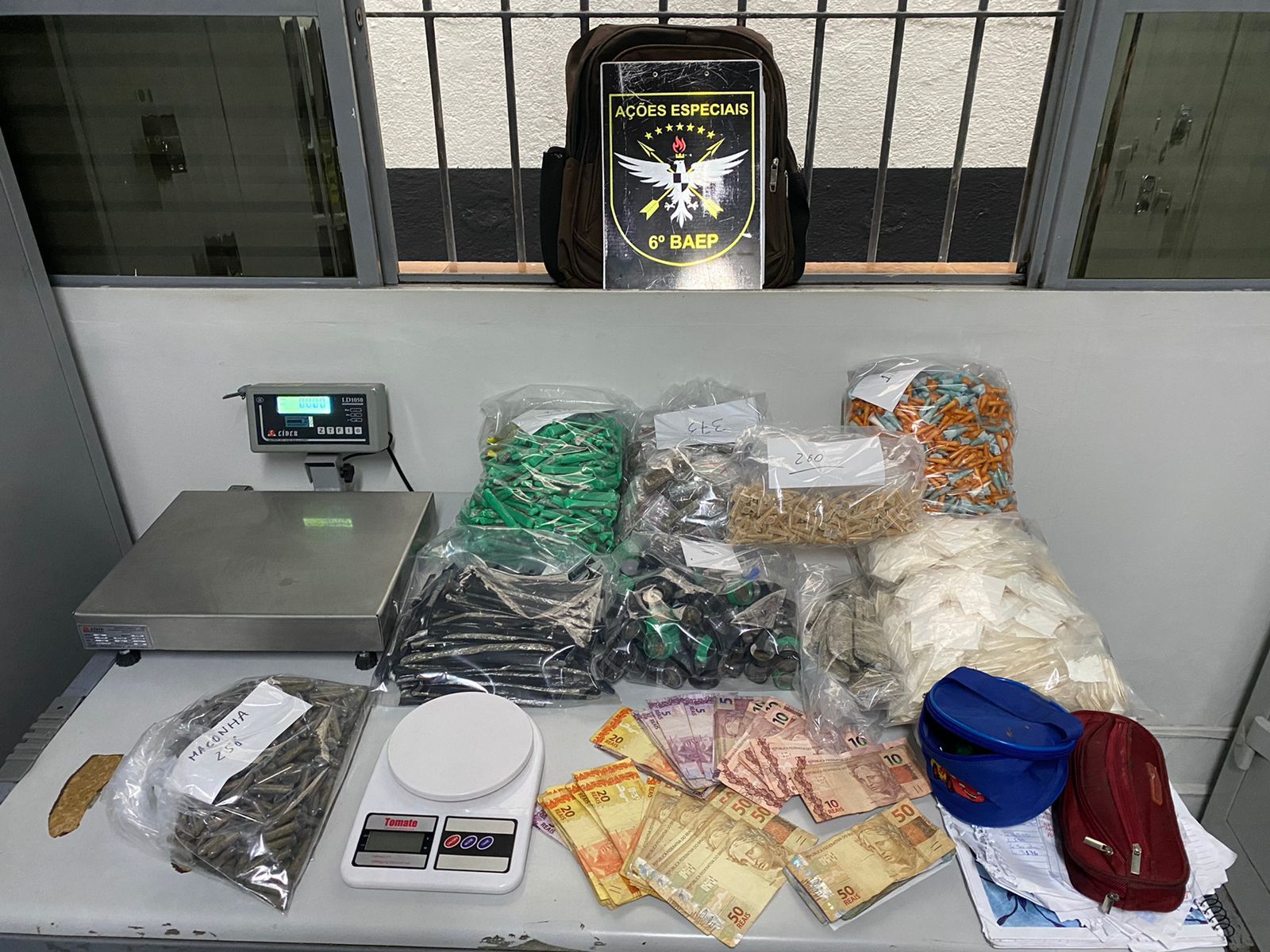 Foram apreendidas diversas quantidades de maconha, cocaína e crack, juntamente com papéis relacionados ao tráfico e uma balança de precisão.