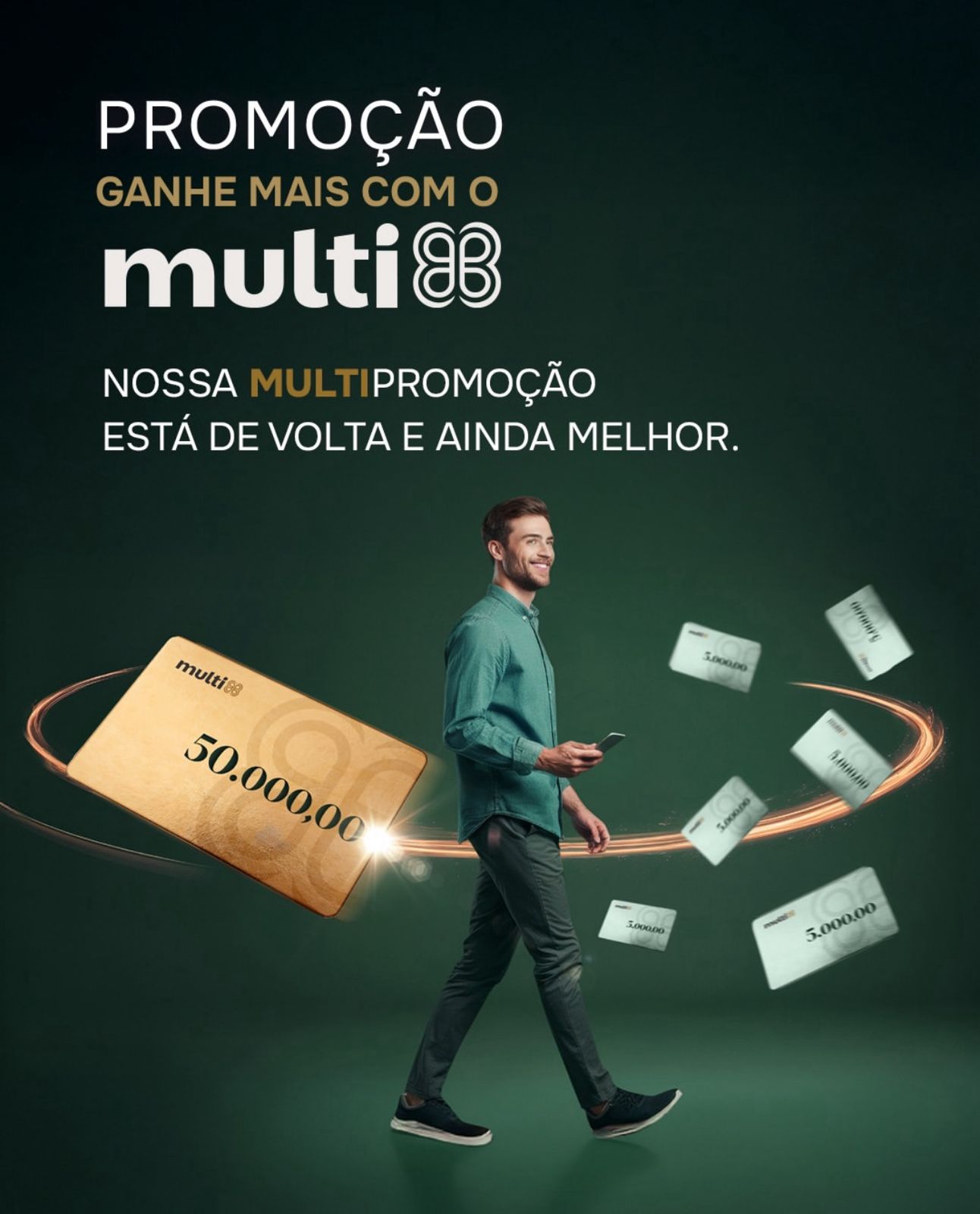 Até o dia 29 de setembro, a cada R$ 400 em compras, cadastradas com CPF no app Multi, o cliente recebe números da sorte para concorrer a vales-compras semanais de R$ 5 mil e a um super prêmio final de R$ 50 mil.