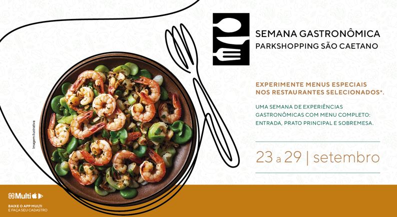 Até 29 de setembro (domingo), o ParkShopping São Caetano realiza a primeira edição da Semana Gastronômica, trazendo opções de menu completo, com entrada, prato principal e sobremesa, a partir de R$69,90 em restaurantes selecionados.