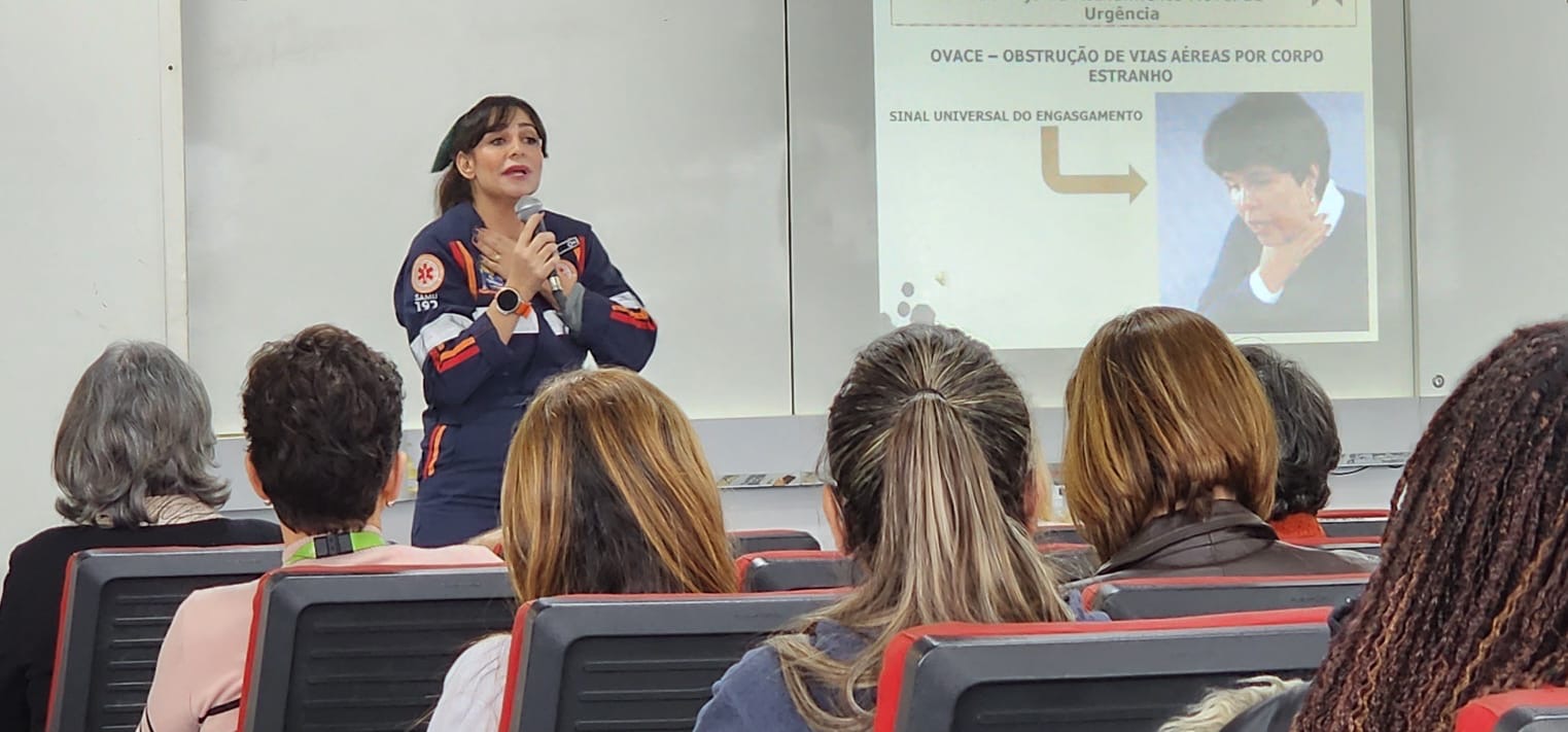 Cerca de 70 gestores da rede de Educação da Prefeitura de Mauá assistiram atentamente as explicações sobre as manobras necessárias em emergências que envolvam o engasgamento e a desobstrução de vias aéreas por corpo estranho, desenvolvida pela enfermeira Carol Straccini, do Serviço de Atendimento Móvel de Urgência de Mauá (SAMU).
