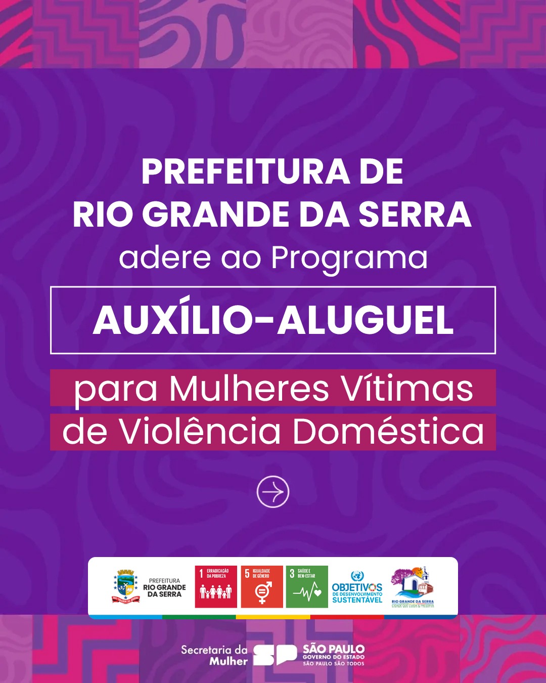 A Prefeitura de Rio Grande da Serra anuncia sua adesão ao Programa de Auxílio Aluguel, uma iniciativa do Governo do Estado de São Paulo destinada a mulheres vítimas de violência doméstica. Este programa tem como objetivo oferecer apoio financeiro temporário às mulheres em situação de vulnerabilidade que possuam medida protetiva expedida por um órgão do poder judiciário, conforme os termos da Lei Maria da Penha.