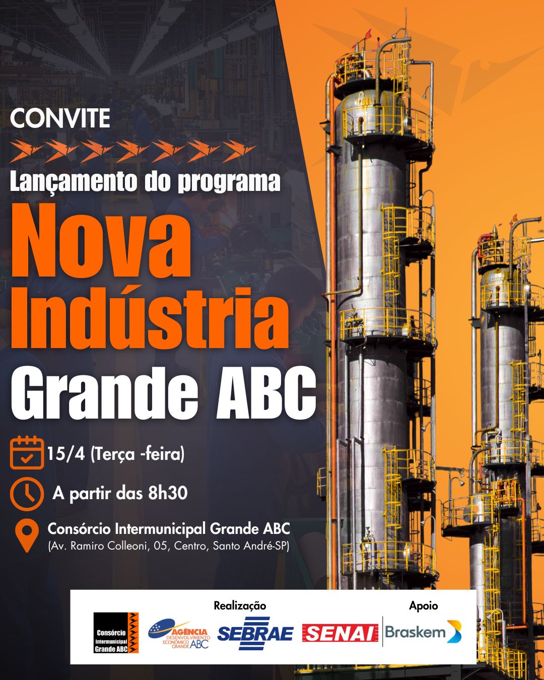 O Grande ABC lança, na próxima terça-feira (15/4), o Programa Nova Indústria do Grande ABC. A iniciativa é uma ação do Consórcio Intermunicipal Grande ABC, da Agência de Desenvolvimento Econômico Grande ABC e do Serviço Brasileiro de Apoio às Micro e Pequenas Empresas (Sebrae).