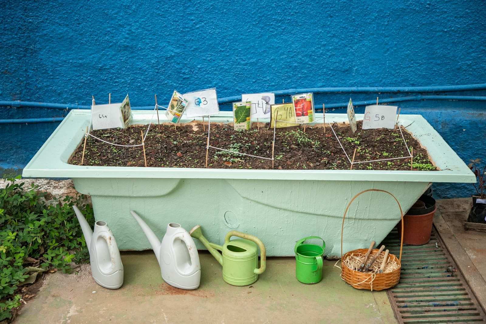 Além de aproveitar uma antiga banheira e garrafas pet como vasos, a escola também recebeu uma solução projetada pelos alunos de Arquitetura: uma estrutura criada com conexões de PVC, totalmente desmontável, que pode ser adaptada a diferentes espaços.