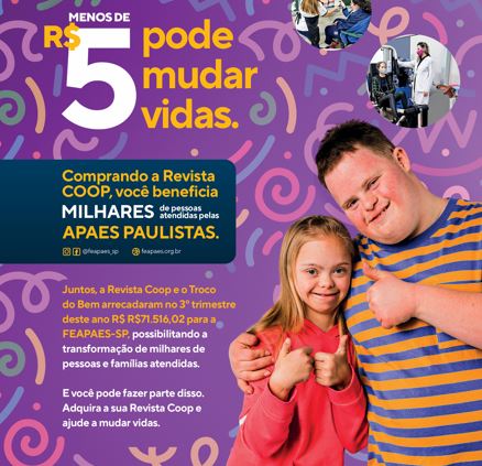 A parceria de sucesso entre a Coop e a FEAPAES-SP teve início em agosto de 2010 e contribui para a continuidade do assessoramento que a Federação promove às APAEs do estado de São Paulo, por meio de capacitações, cursos, projetos e o suporte nas áreas de assistência social, educação, gestão, jurídica e saúde. O movimento apaeano paulista atende mais de 70 mil pessoas com deficiência intelectual e/ou múltipla e Transtorno do Espectro Autista diretamente.