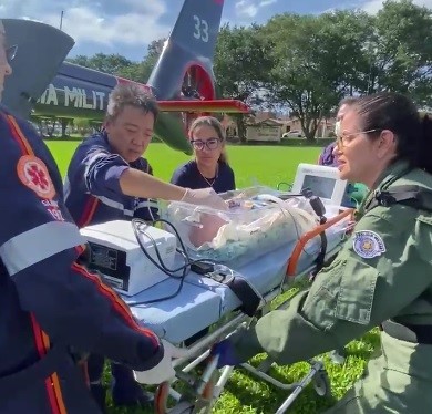A aeronave fez o transporte do bebê em uma incubadora. Enfermeiros do Samu deram o apoio para fazer o deslocamento do recém-nascido até o helicóptero. Por causa da gravidade e sensibilidade do caso, foi fundamental a utilização do Águia 33, que conta com a UTI aeromédica, para remoção do bebê entubado.