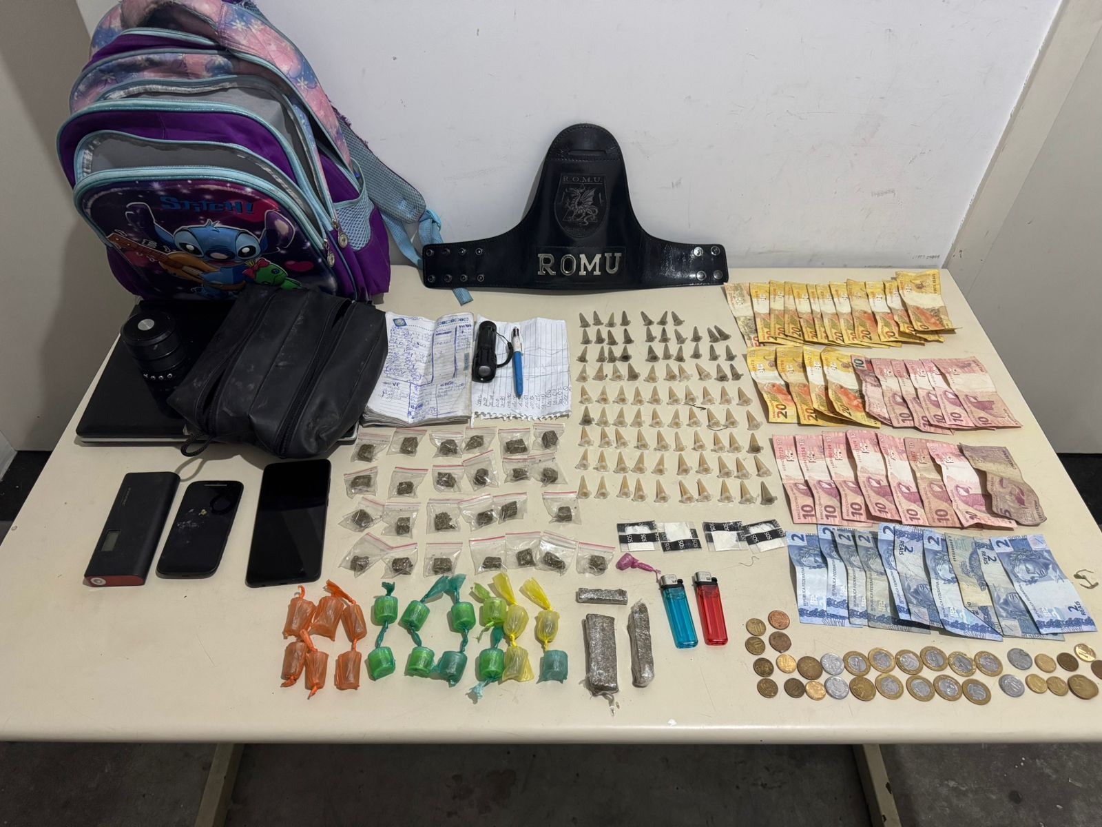 Com os detidos foram encontrados entorpecentes, aparelhos celulares, dinheiro em espécie e uma mochila utilizada para o transporte dos materiais.