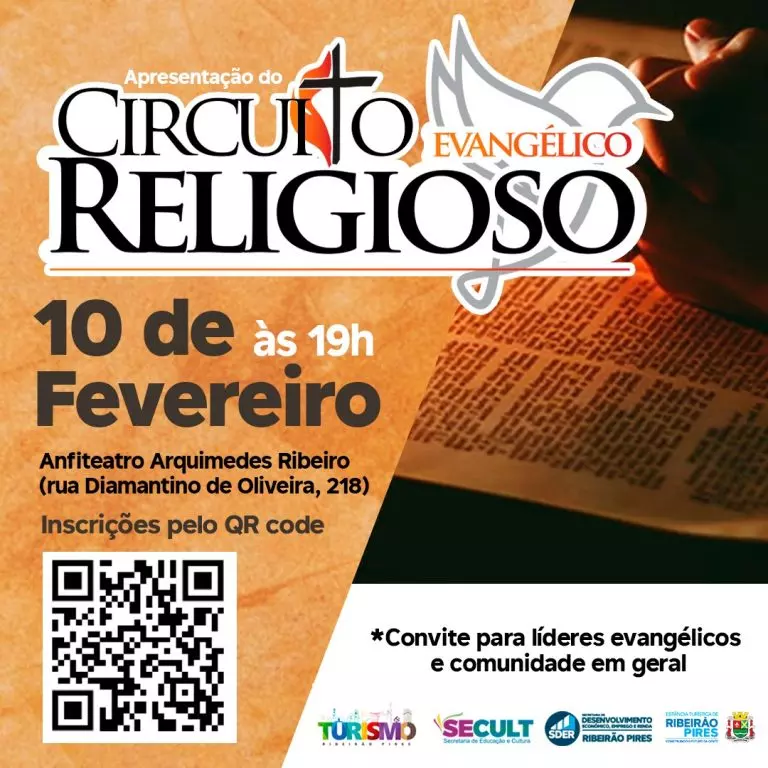A prefeitura de Ribeirão Pires, por meio da Secretaria de Desenvolvimento Econômico, Emprego e Renda (SDER), Secretaria de Turismo e a Secretaria de Educação e Cultura (SECULT) vai reunir líderes evangélicos no dia 10 de fevereiro, às 19h, no Anfiteatro Arquimedes Ribeiro, para apresentar o Circuito Religioso Evangélico. A proposta visa fomentar o turismo da fé na Estância, potencializando talentos e proporcionando capacitação técnica audiovisual às igrejas.
