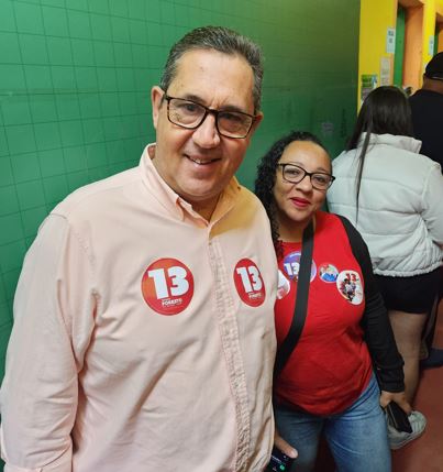 O candidato Renato Foresto (PT) e sua vice, Tati Tibério, votaram hoje (6) pela manhã. Renato votou no bairro Ouro Fino, na E.E. Senador Casemiro da Rocha e sua vice, na E.E. João Roncon.
