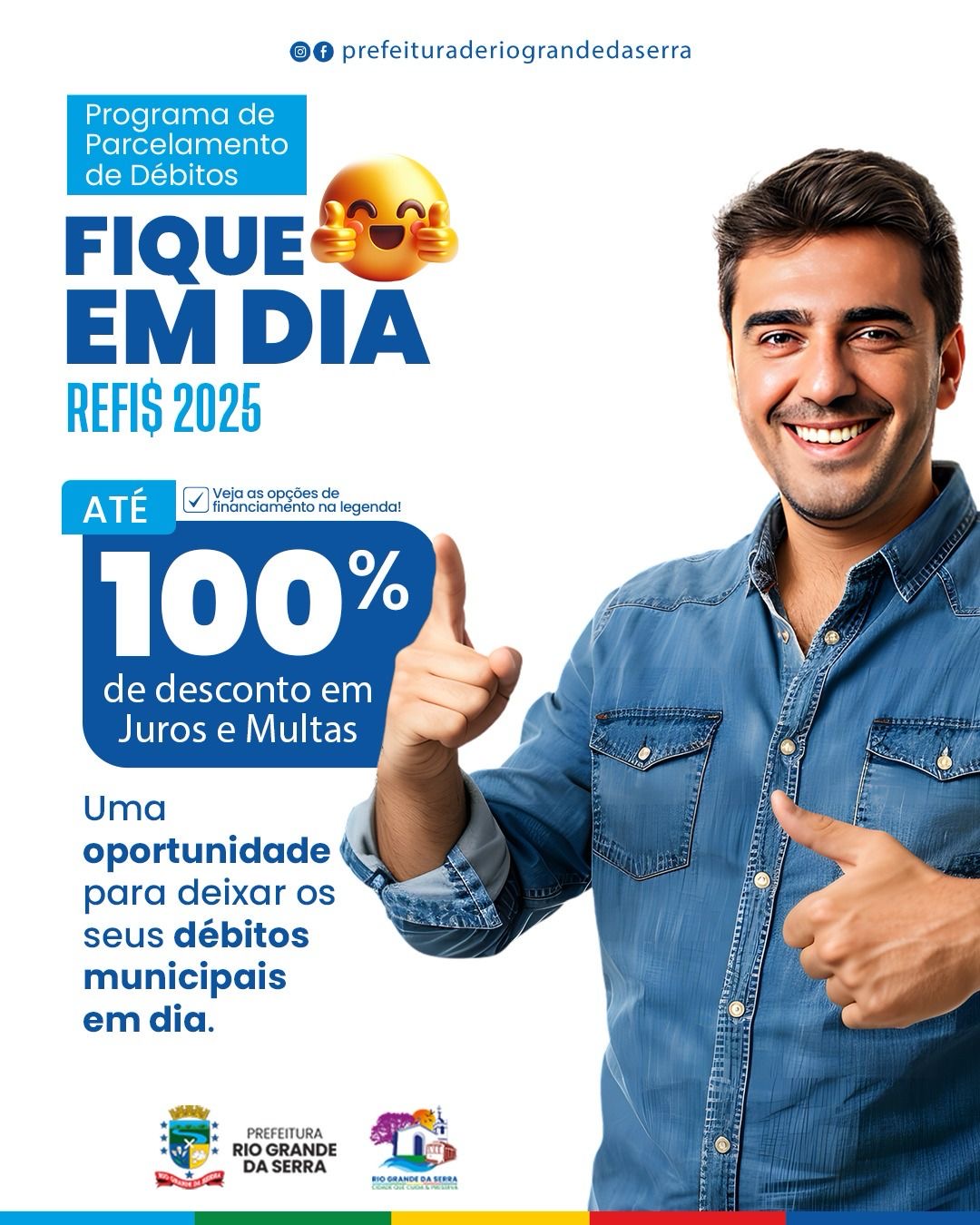 A Prefeitura de Rio Grande da Serra anuncia o lançamento do Programa “Fique em Dia”, estabelecido pela Lei Municipal nº 2622, de 07 de abril de 2025.