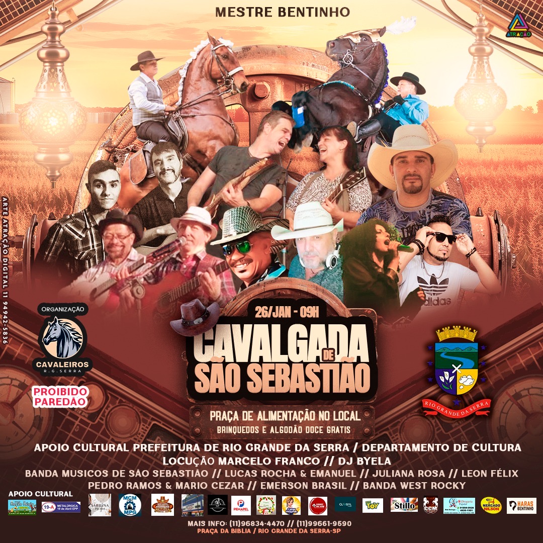 A Prefeitura Municipal de Rio Grande da Serra anunciou a realização da 7ª Cavalgada e Festa do Padroeiro São Sebastião, que acontecerá no dia 26 de janeiro, na Praça da Bíblia, localizada na Avenida Dom Pedro I, Centro.