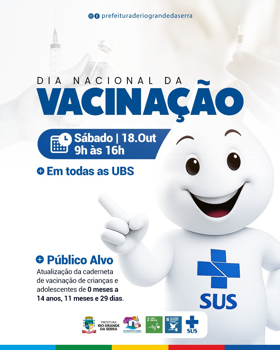 Neste sábado (18), a Prefeitura de Rio Grande da Serra, por meio da Secretaria Municipal de Saúde, realiza o Dia Nacional da Vacinação, com atendimento em todas as Unidades Básicas de Saúde (UBS) do município, das 9h às 16h.