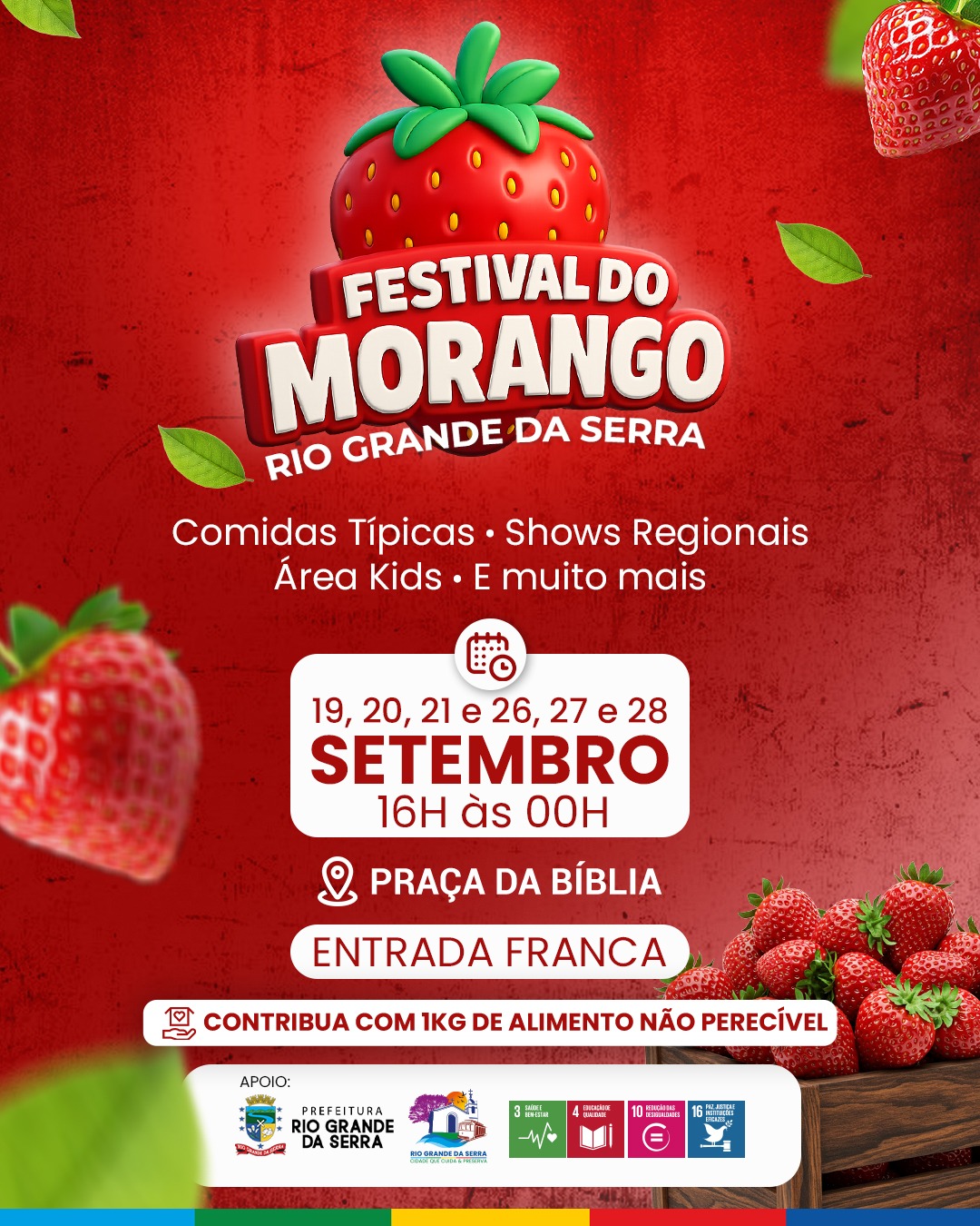 A cidade de Rio Grande da Serra vai ganhar um novo sabor em setembro! Vem aí o 1º Festival do Morango, um evento inédito que promete encantar moradores e visitantes com uma programação especial para toda a família.