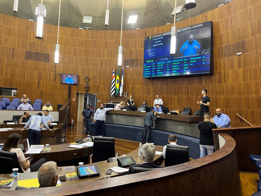 Até o bispo Dom Pedro Carlos Cipolini, da Diocese de Santo André, que esteve presente na sessão para apresentar os objetivos da Campanha da Fraternidade 2023, cujo tema é Fraternidade e Fome, aproveitou a tribuna e terminou seu discurso pedindo aos vereadores “ajuda” para resolver os problemas da Sabesp na cidade.