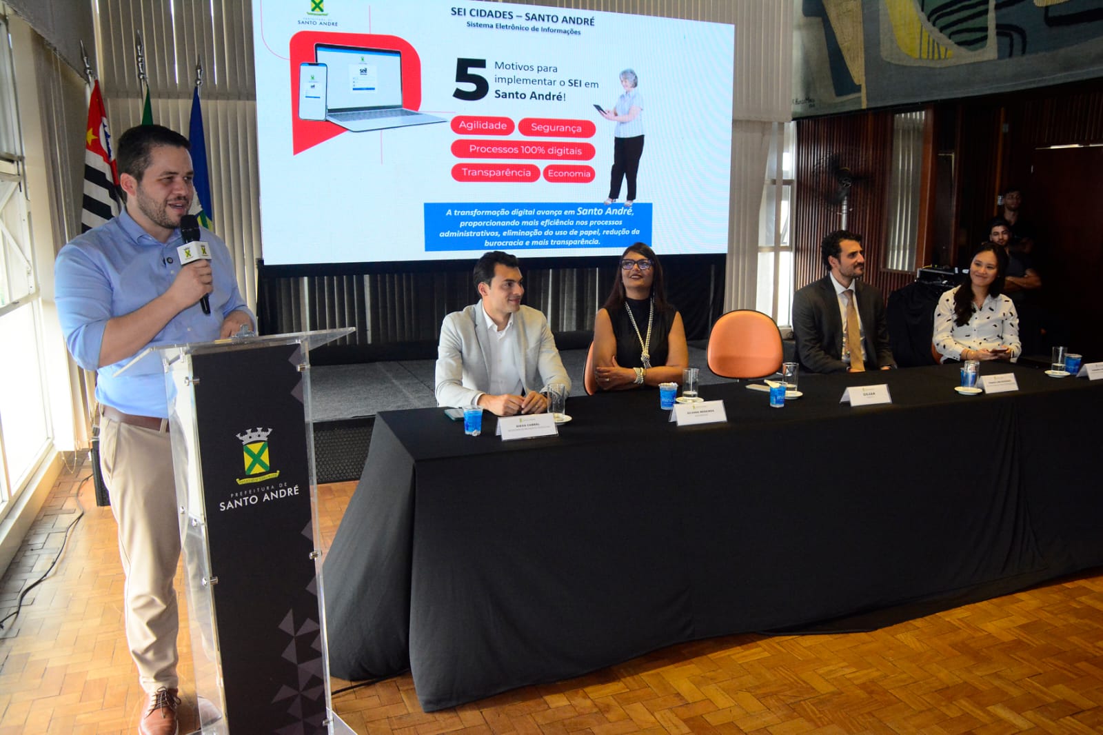 “O SEI é um sistema que permite resposta imediata, trazendo agilidade, segurança, transparência, sustentabilidade e economia para a Prefeitura de Santo André”, declarou o prefeito Gilvan Junior durante evento realizado nesta quarta, no Salão Burle Marx.