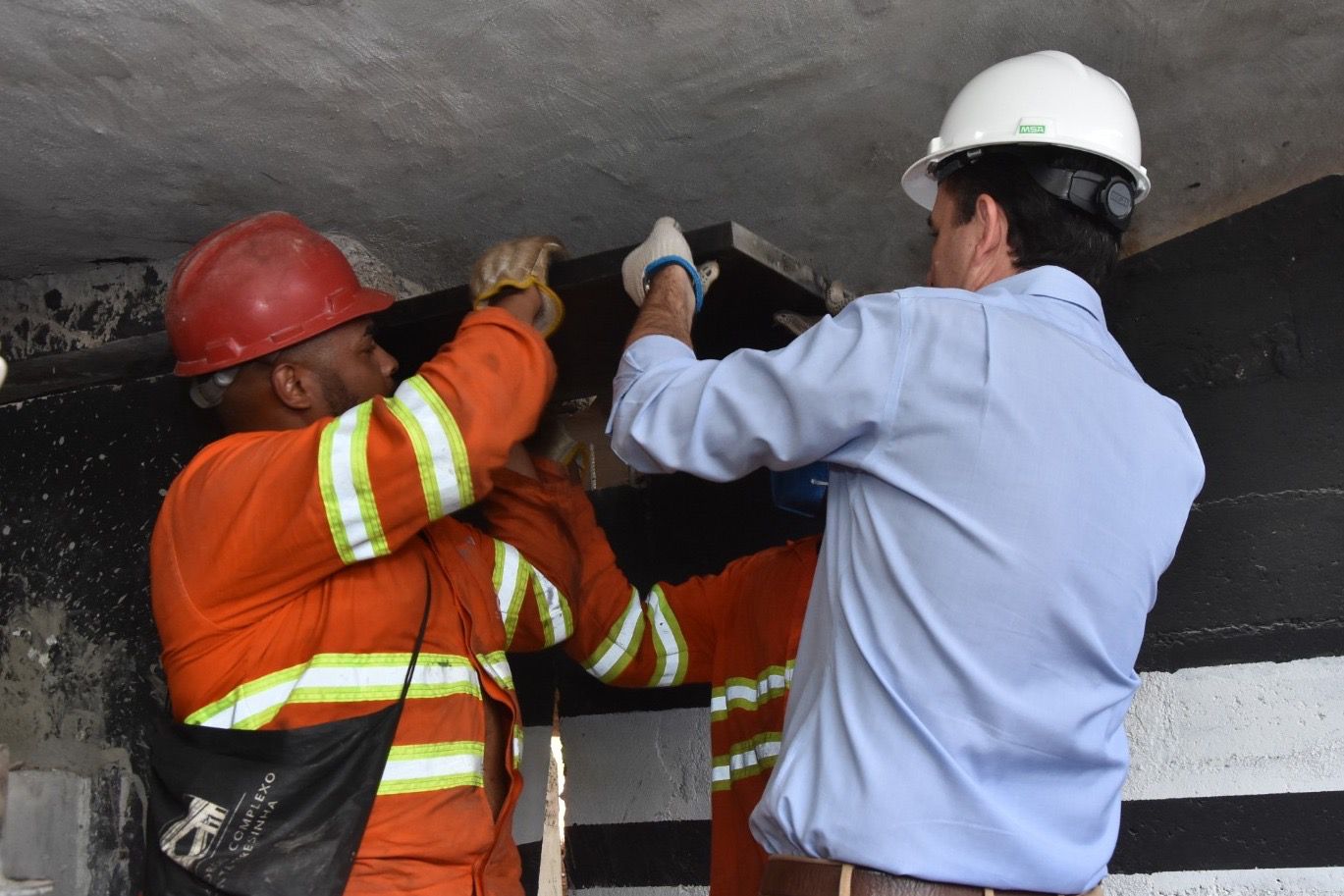 O serviço de substituição das placas de amortecimentos é realizado nos 36 pilares do Viaduto Castelo Branco e envolve 96 operações distintas para elevação do viaduto e aplicação das novas estruturas.