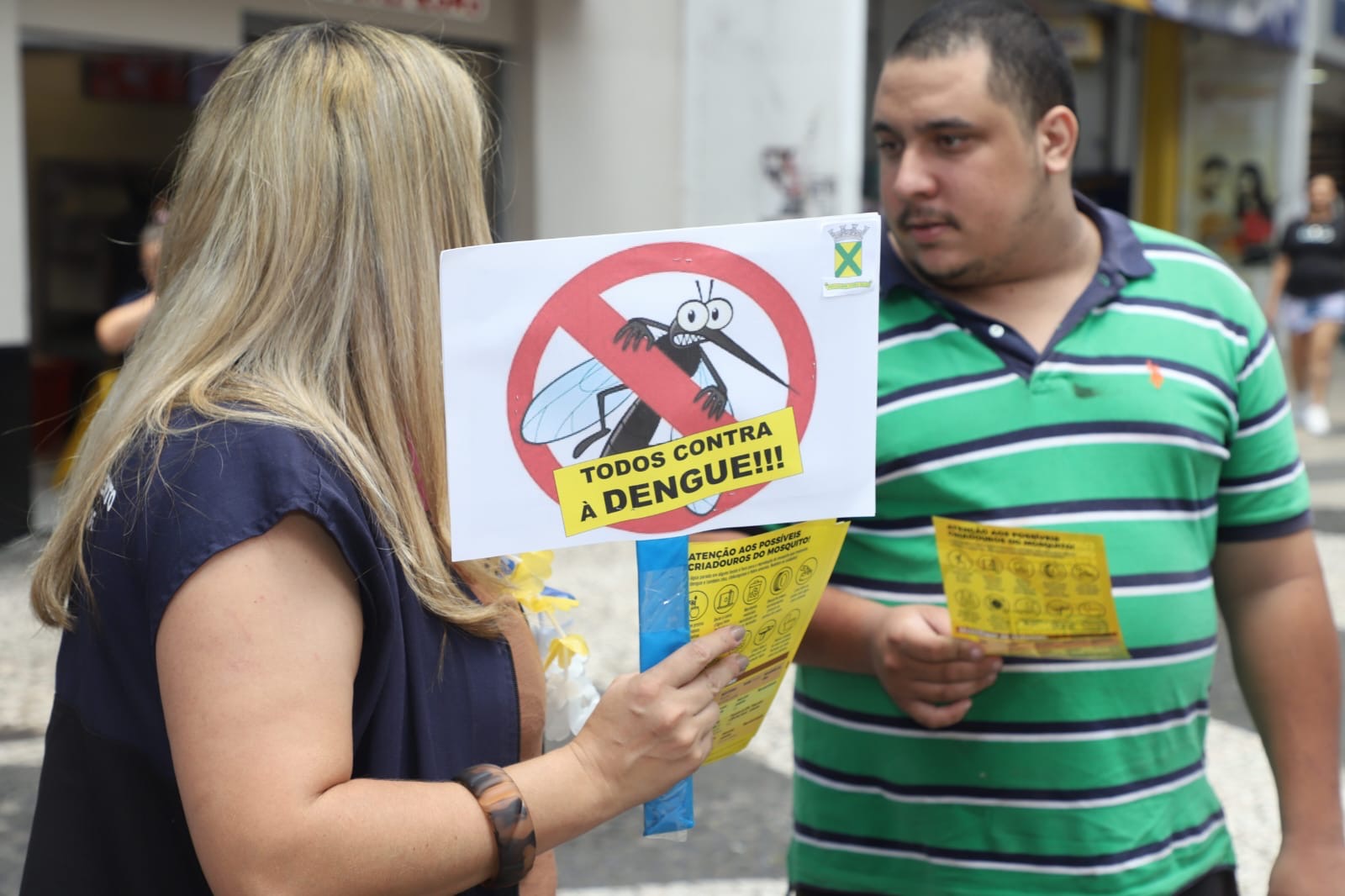 Durante a ação, que durou o dia todo, técnicos circularam pelo calçadão distribuindo panfletos informativos e conversando com os munícipes, além de mostrarem larvas do mosquito para que as pessoas fiquem atentas.