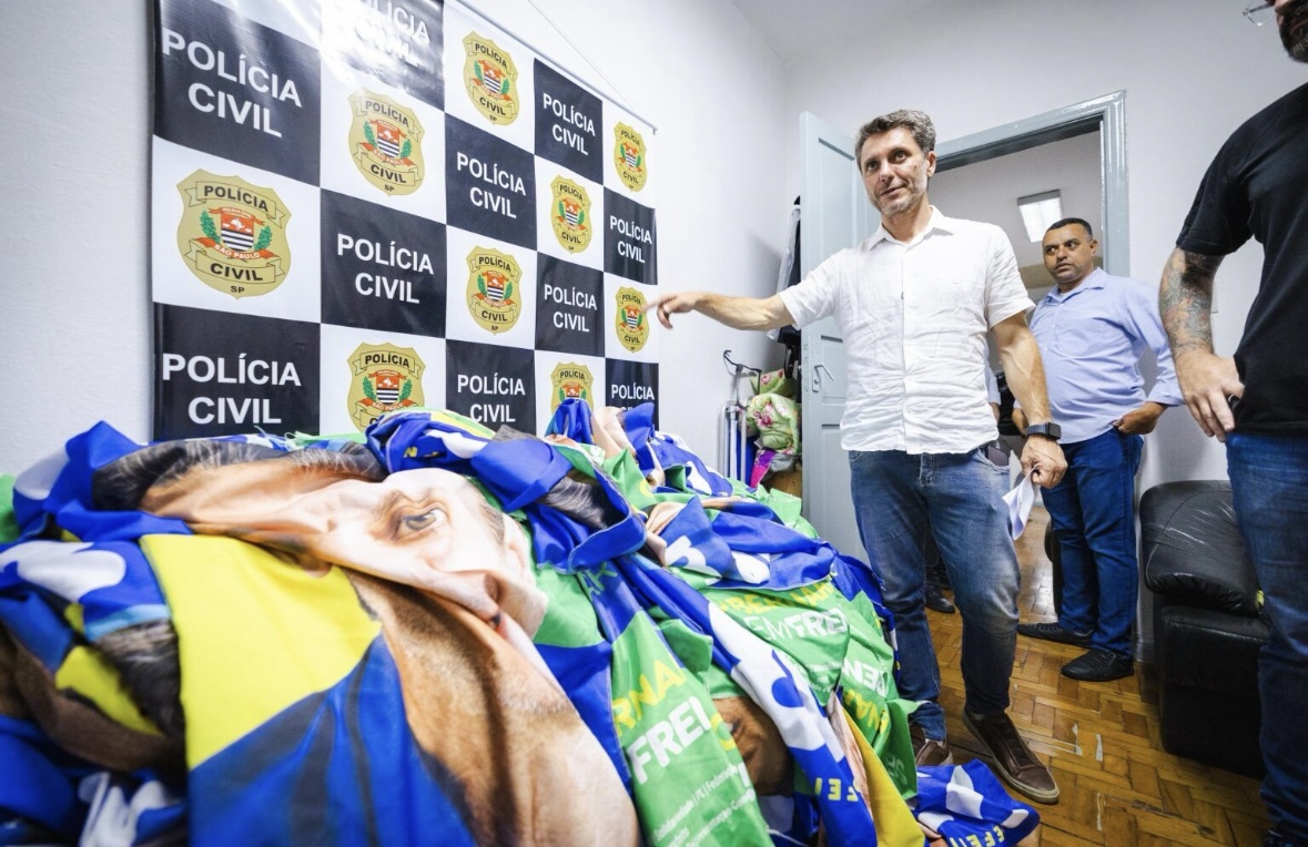 Ele esteve no 5° DP após a prisão de três suspeitos de roubar 100 bandeiras dele distribuídas nas ruas. Na mesma semana, uma apoiadora teve o veículo vandalizado.