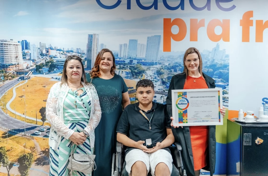 Durante a data, o prefeito Marcelo Lima entregou o primeiro diploma do ‘Selo Empresa Amiga do Autista’ para Flávia Cristina Cabezaolias, sócia da Datamace Informática, pela contratação de Leoni Frazão de Oliveira, de 17 anos, que também esteve no gabinete junto com a mãe, Mariluci, e a avó, Lurdes Oliveira.