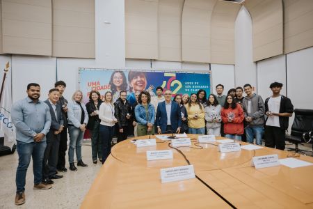 Em agenda que une capacitação, emprego e viés social, o prefeito de São Bernardo, Marcelo Lima, recebeu nesta segunda-feira (4) grupo de estudantes da E.E. Omar Donato Bassani, no Pós-Balsa, que estão entre os inscritos no Programa Manuel Querino de Qualificação Social e Profissional.