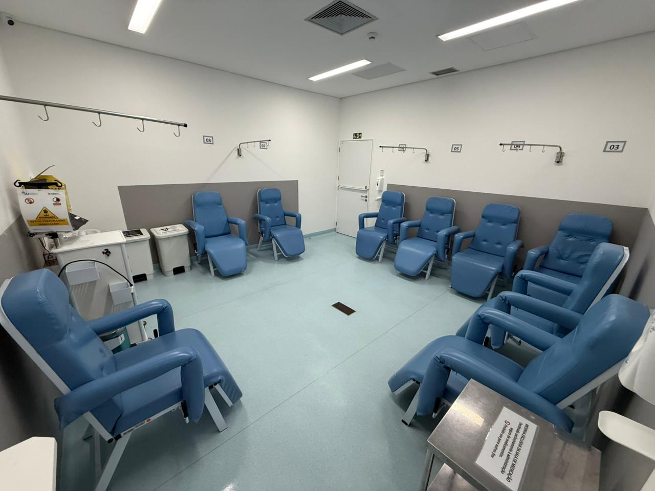O ambiente conta com nove poltronas fixas, com possibilidade de ampliação conforme a necessidade operacional em dias de maior lotação.