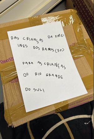 A escola enviou uma caixa de doações de materiais escolares para as crianças desabrigadas pelas enchentes e, dentro da caixa, seguiram inúmeras cartinhas com desenhos e mensagens de esperança feitos pelas crianças da EMEI.
