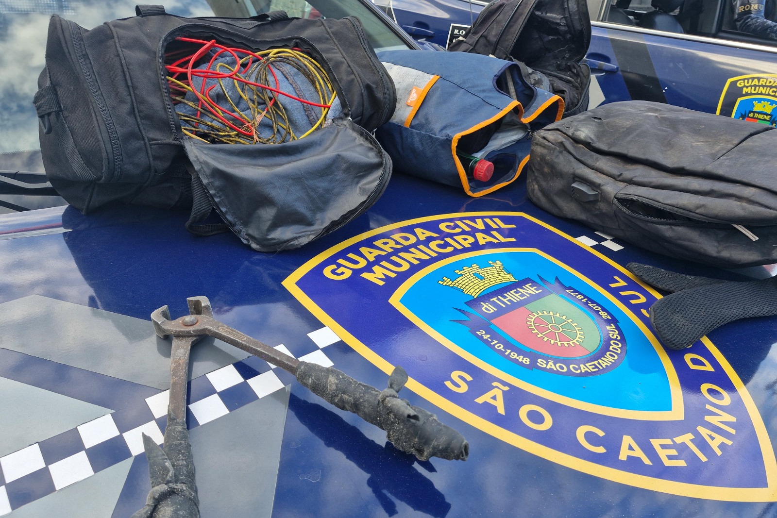 Assim que a equipe da ROMU (Rondas Ostensivas Municipais) chegou ao local e iniciou a busca pessoal foram encontrados diversos objetos, usualmente associados na prática de furtos: três alicates, cinco chaves de fendas, duas facas, um par de luvas, uma porta de alumínio, disjuntores, pedaços de canos de cobre retorcidos, pedaços de alumínio retorcidos, pedaços de fios e uma torneira.