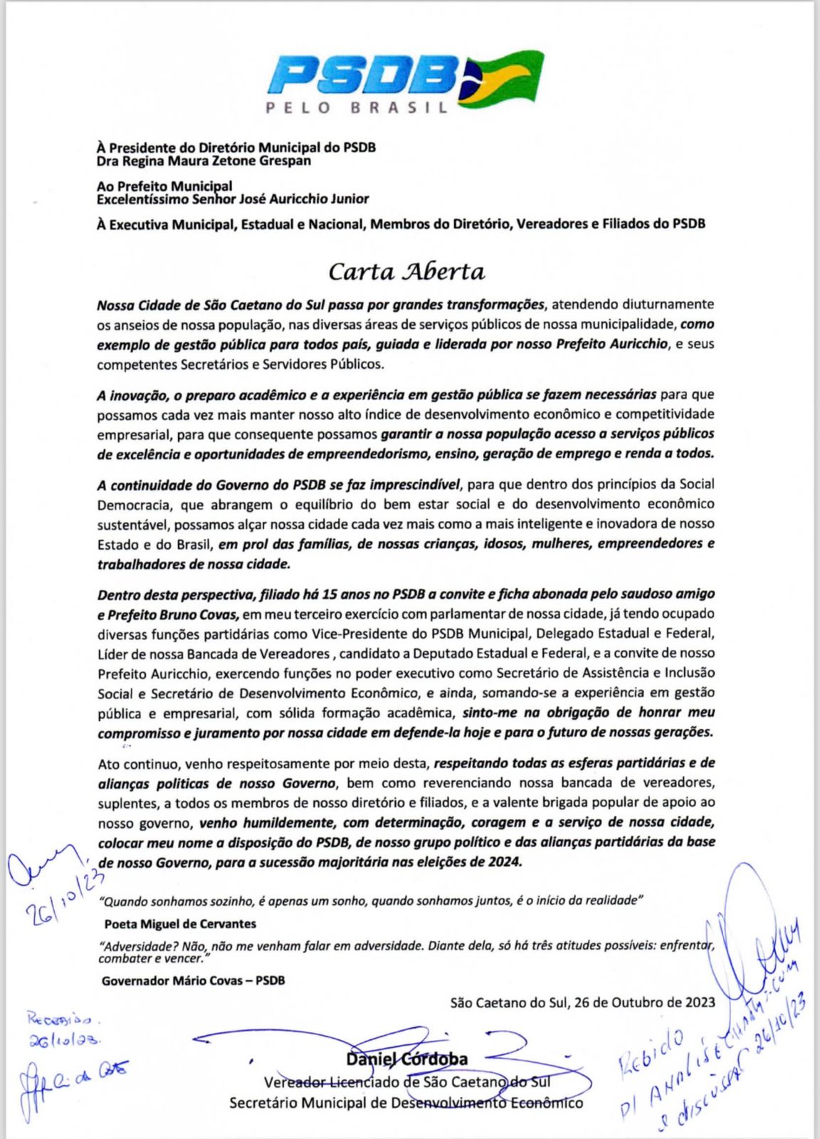 O secretário de Desenvolvimento Econômico e vereador licenciado, Daniel Córdoba, protocolou carta colocando o nome à disposição do PSDB para a disputa majoritária de 2024.