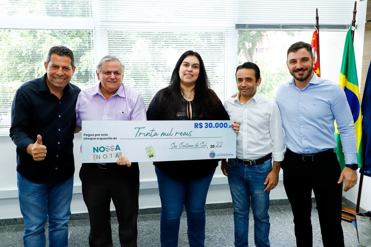 A Prefeitura de São Caetano do Sul entregou a última premiação de 2022 do Programa Nossa Nota a contribuintes sorteados que exigiram nota fiscal de prestação de serviços na cidade. O evento desta quinta-feira (10/11) foi realizado no Espaço Nelly Pellegrino e contou com as presenças do prefeito em exercício, Carlos Humberto Seraphim, de secretários municipais e vereadores, além de premiados. Foram concedidos um prêmio de R$ 30 mil e dez prêmios de R$3 mil, totalizando R$ 60 mil.