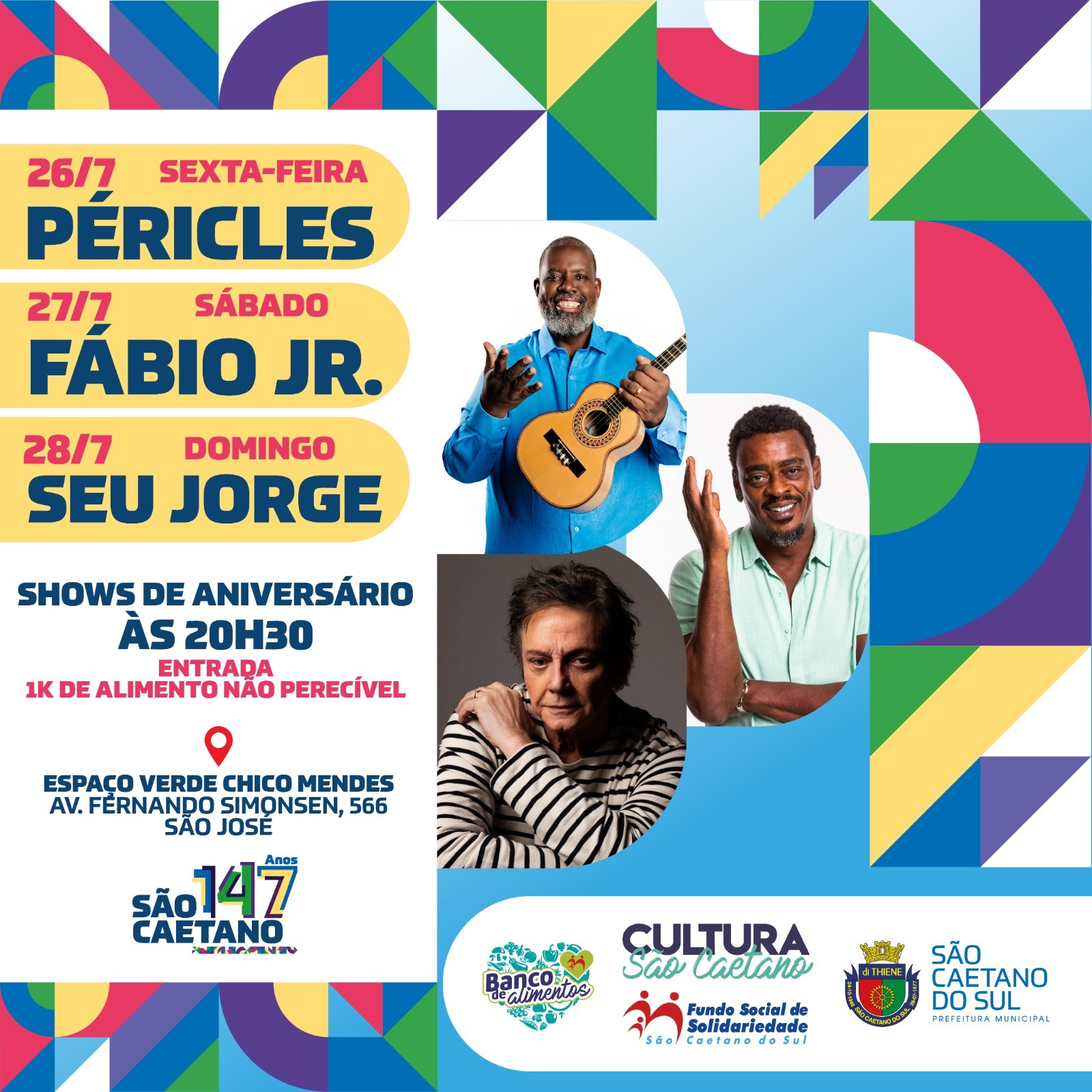 O Espaço Verde Chico Mendes (Avenida Fernando Simonsen, 566, Bairro Cerâmica) será palco de três grandes shows, com entrada mediante a doação de 1kg de alimento não perecível.
