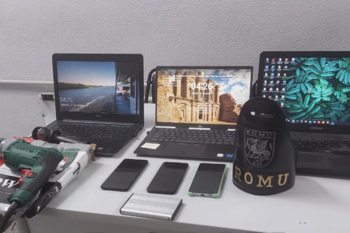 Na busca pessoal, o homem foi questionado sobre a origem dos objetos e confessou ter praticado o furto. Com ele foram encontrados três laptops, três celulares, uma furadeira nova e um HD externo, que foram devolvidos ao proprietário da empresa. O responsável pela empresa foi contatado e compareceu ao local para identificar os objetos furtados.