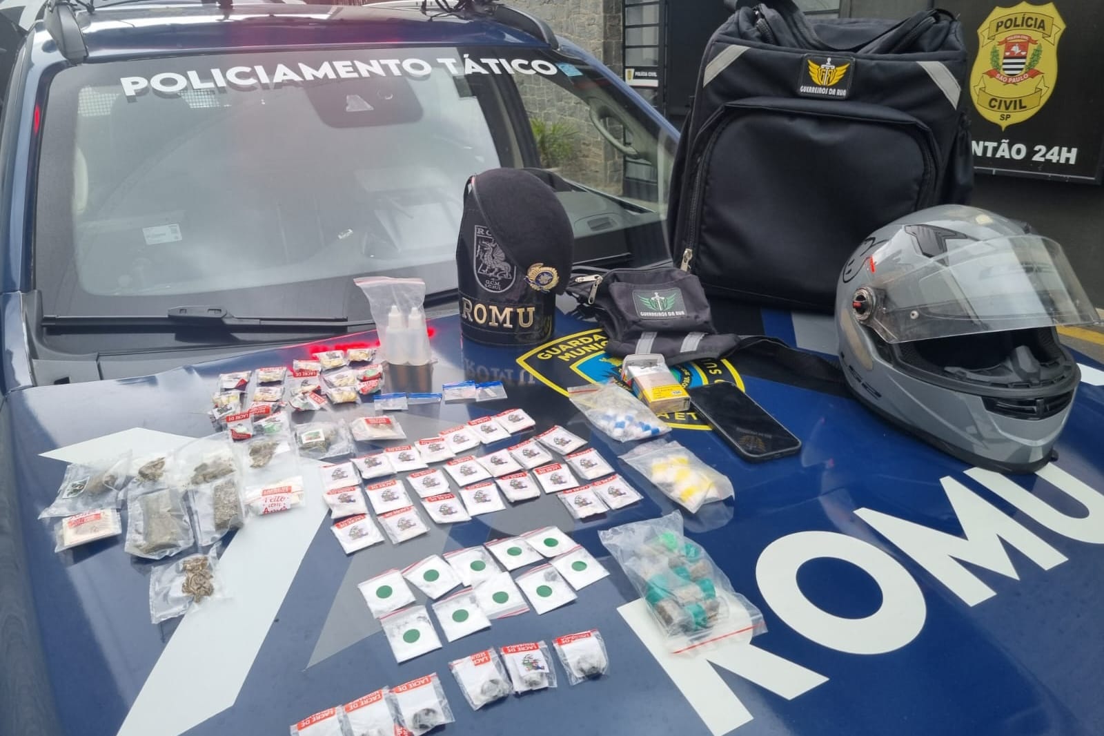 Rapidamente, uma equipe da ROMU (Rondas Ostensivas Municipais) localizou e abordou o indivíduo. Durante a busca veicular, foram encontrados diversos entorpecentes.