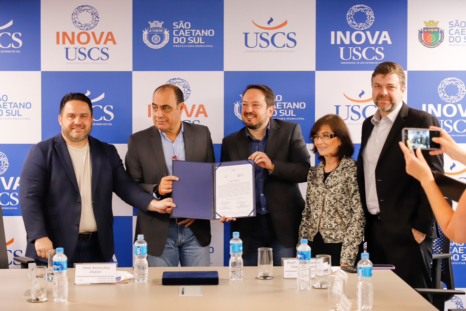 O reitor da USCS, Leandro Prearo, e o prefeito de São Caetano do Sul, José Auricchio Júnior, assinaram na terça-feira (5) parceria para o início dos trabalhos do Centro Inova USCS para o Desenvolvimento Regional.