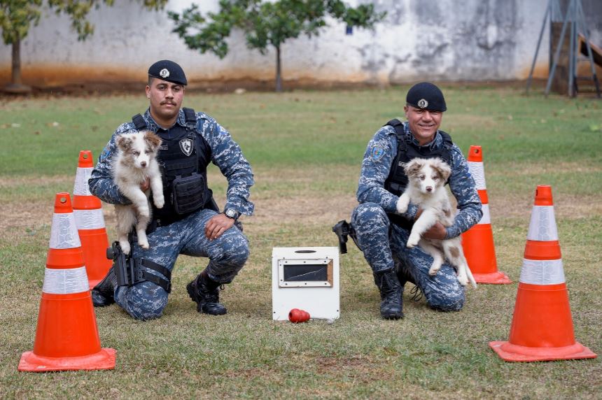 Aslan e Aegon, de apenas 70 dias de vida, são Border Collies e estão em treinamento para reforçar a inspetoria e auxiliar nas operações, patrulhamento e até mesmo no fortalecimento dos vínculos da corporação com a comunidade.
