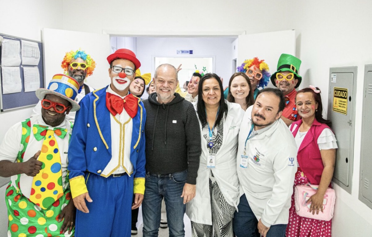 A interação teve brincadeiras, humor, música e oração, levando os benefícios da terapia do riso aos pacientes.