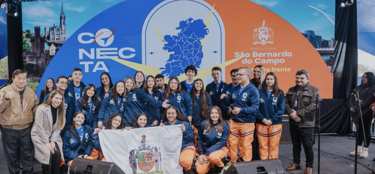 Emocionado, o prefeito Marcelo Lima entregou a bandeira da cidade aos alunos. “Vocês serão São Bernardo na Irlanda”.