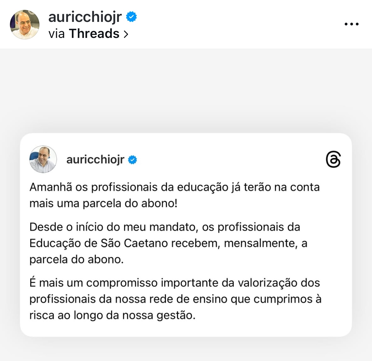 “ Amanhã (27) os profissionais da educação já terão na conta mais uma parcela do abono! Desde o início do meu mandato, os profissionais da Educação de São Caetano recebem, mensalmente, a parcela do abono. É mais um compromisso importante da valorização dos profissionais da nossa rede de ensino que cumprimos à risca ao longo da nossa gestão”, disse em publicação na rede social.