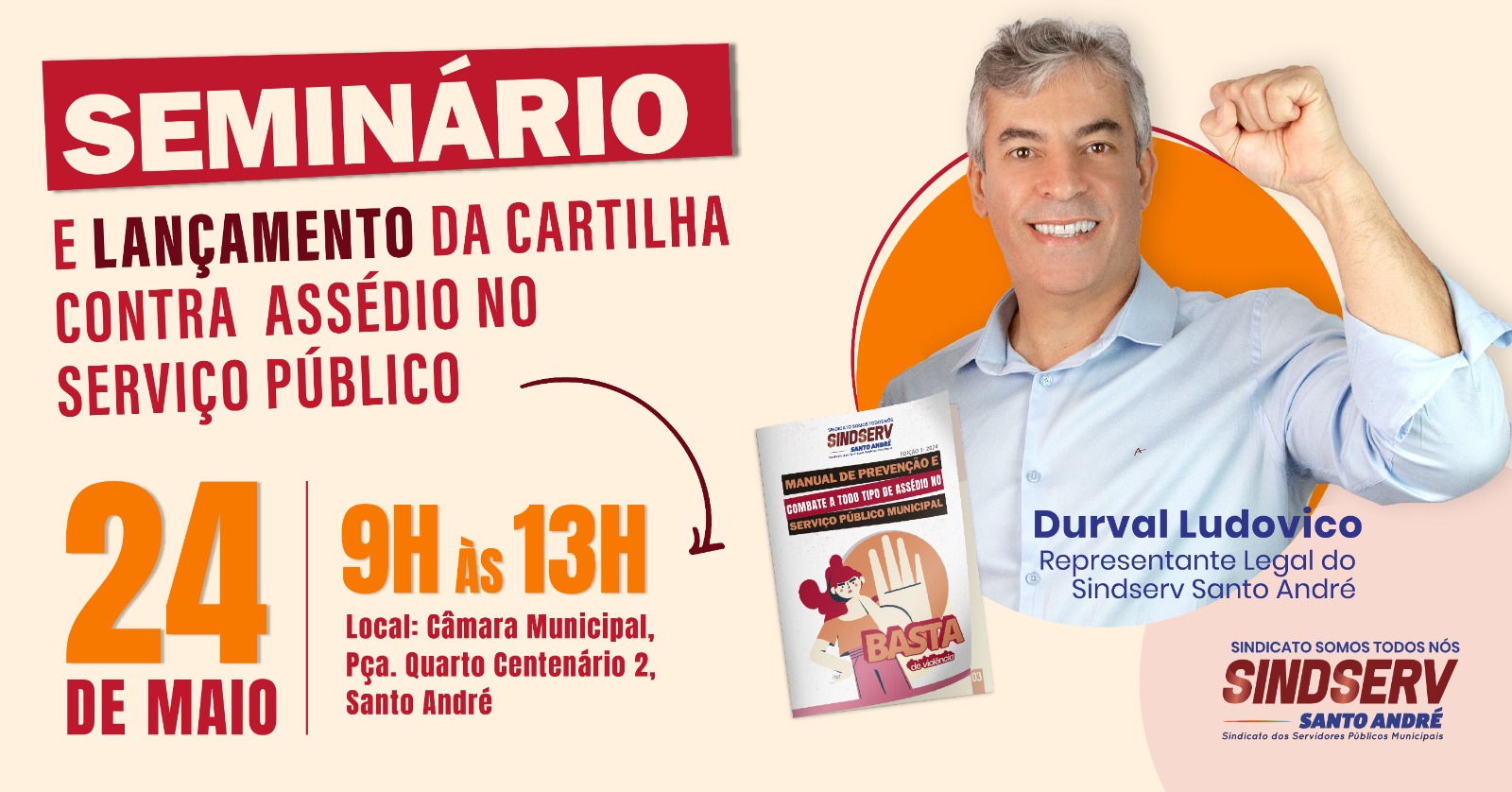 O Sindicato dos Servidores Públicos Municipais de Santo André (Sindserv SA ) promoverá nesta sexta-feira (24), o Seminário e Lançamento do “Manual de Prevenção e Combate a todo tipo de Assédio no Serviço Público”, das 9h às 13h, no anfiteatro da Câmara Municipal, localizada à Praça Quarto Centenário, 2 em Santo André.