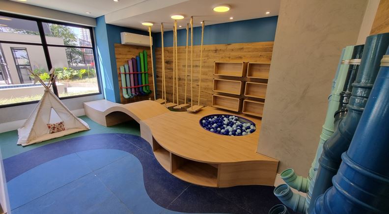 O lúdico, aliado ao sustentável, chama a atenção em cada detalhe da brinquedoteca. Uma ponte de balanços, feita em madeira reflorestada e corda, termina na piscina de bolinhas, que fica ao lado de um brinquedo feito com túneis de canos. No piso anti-impacto, com borracha de reciclagem, uma tenda em algodão cru no estilo indígena estimula a imaginação das crianças, seja para a leitura, o brincar ou o descanso. Compondo a diversão sustentável, no meio da brinquedoteca tem uma ponte em arco de madeira para pular ou se rastejar, e ao final, um xilofone colorido em tubos de pvc, que emitem sons em variados tons.