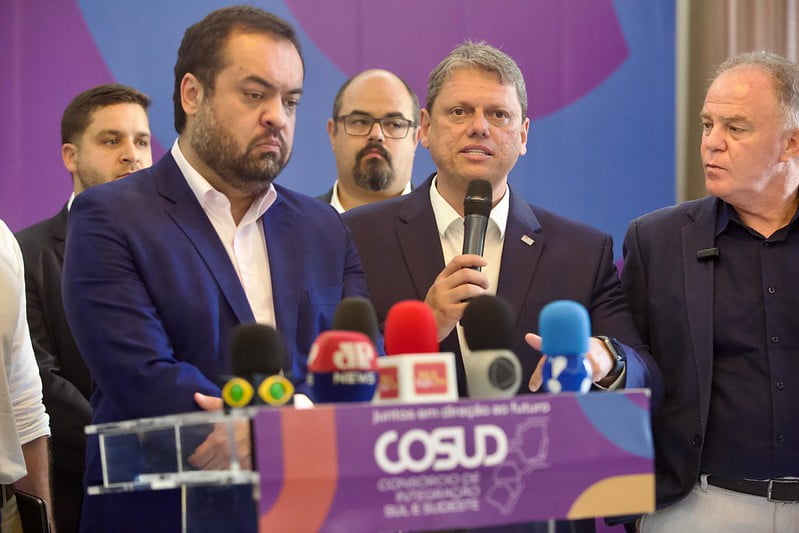 O governador Tarcísio de Freitas participou neste sábado (4) da apresentação da Carta do Rio de Janeiro, documento que reúne um conjunto de propostas para o desenvolvimento de políticas públicas dos estados participantes do 7ª Consórcio de Integração Sul e Sudeste (Cosud). A revisão do Pacto Federativo, as concessões de saneamento e a Reforma Tributária foram os principais temas abordados pelos governadores de São Paulo, Rio de Janeiro, Minas Gerais, Espírito Santo, Rio Grande do Sul, Santa Catarina e Paraná.