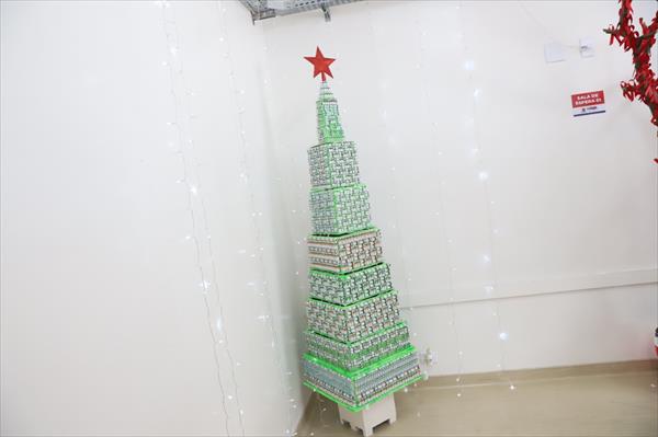 Foram necessários 2.100 recipientes vazios de imunizantes para a confecção dos símbolos natalinos, ambos 100% sustentáveis. A árvore maior, com 2,10m de altura, utiliza madeiras recuperadas de ecoponto e é decorada com frascos, enquanto a de mesa mede 30cm e é composta por embalagens de vacina e lâmpadas de LED.